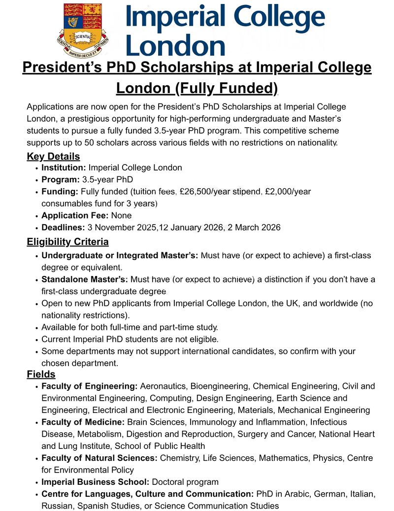 President’s PhD Scholarships – Imperial College London - 50 Fully Funded Scholarships 2026